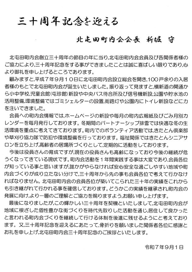 ・町内会設立アンケートのお願い 7月 8日 お知らせ(第3号)町内会設立準備委員会発行 ・町内会設立アンケートのお願い・回収ハガキ 22日 お知らせ(第4号)町内会設立準備委員会発行 ・町内会設立アンケート結果 8月 お知らせ(第5号)町内会設立準備委員会発行 ・町内会名アンケート 9月3日 全体説明会/北清掃事務所に於いて お知らせ(第6号)町内会設立準備委員会発行 9月10日 町内会設立総会/北清掃事務所に於いて お知らせ(第7号)町内会設立準備委員会発行 北屯田町内会誕生する 平成7年9月10日 町内会発足「北屯田町内会」※会員数/1 0 4世帯