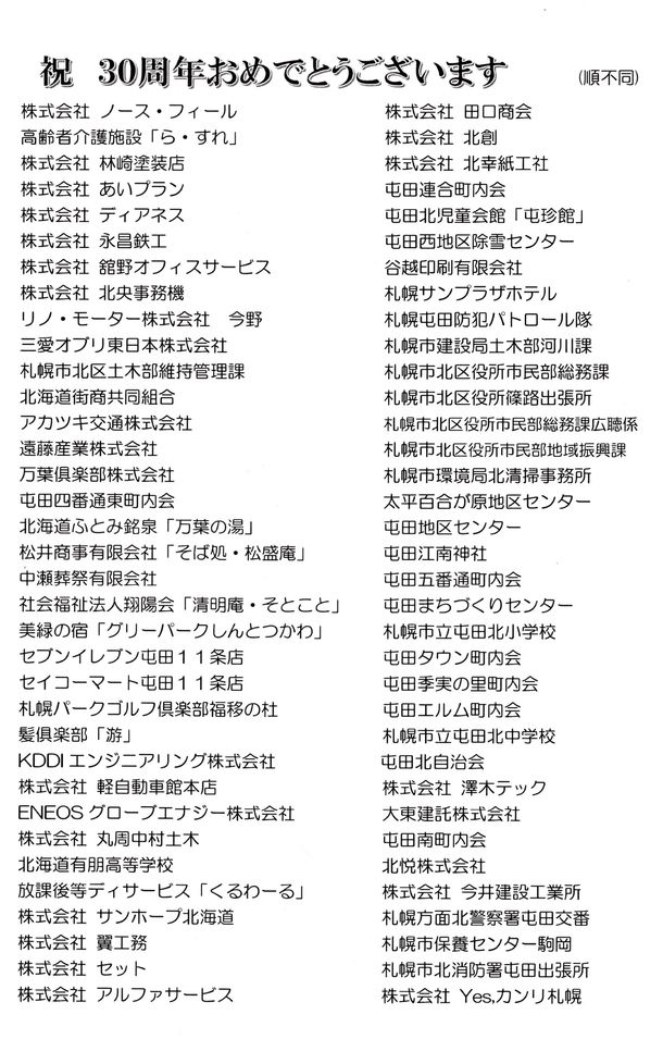15日 ゴミ・シェルター(16ケ所分)設置 6月19日 子ども会サミット・いちご狩り/石狩市 27日 創成の里協議会総会 7月13日 町内会ホームページ完成!! ○h t t p : //www.kita−tonden.com Eメール完成!! ○info@kita−tonden.com ★7月17日 第9回 北とんでん夏まつり開催 収益金376,334円 8月 3日 第1回 ホームページ更新 4日 訃報「西ブロック/加藤 吉雄さん」 訃報「西ブロック/澄川 瑞恵さん」 訃報「東ブロック/二瓶 サタ子さん」 26日 訃報「西ブロック/後藤 敏雄さん」 9月 1日 町内会設立「10周年記念誌」発刊に向けて取組開始 *町内会発足から〜 6日 北海道町内会連合会加盟 20日 敬老祝金贈呈(2名該当) 25日 町内会レク/ぶどう狩り・蘭越町「雪秩父温泉」 10月 5日 クリーンさっぽろ施設見学会/留萌市 ◎会長参加 7日 第2回 ホームページ更新 *地域情報・会長談話・屯田の歴史を増設 8日 屯田地区防犯パトロール隊「とんぼ隊」発足 新堀会長幹事任命/会員50名(登録隊員) 24日 秋の町内清掃・多目的広場閉鎖作業他 11月 9日 訃報「北ブロック/福田 悟さん」 18日 マルチ除雪会議 12月23日 クリスマス会 25日 除雪打合せ 平成17年1月 8日 町内会新年交礼会/札幌サンプラザホテル 2月16〜18日 排雪作業実施/今井建設工業所(株) 3月 総会用予算編成会議 議案書作成 役員選出会議 横新道橋連絡会議 4月23日 第10回「北屯田町内会」定期総会 ※会員数/296世帯