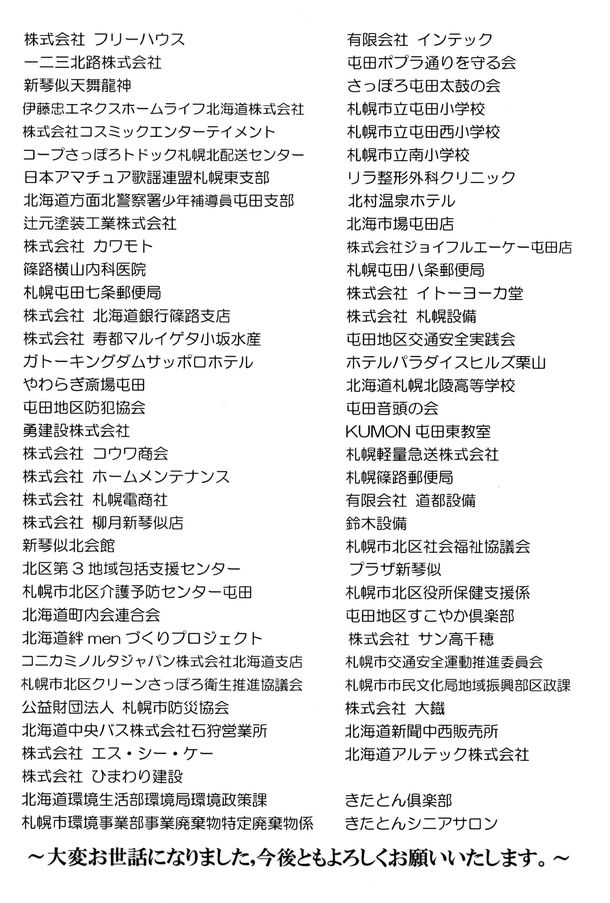 選挙投票所変更 屯田小学校→屯田創成の里記念会館 ★7月20日 第6回 北とんでん夏まつり開催 収益金1 2 0,803円 11月11日 町内会レク/岩内町「グリーンパークいわない」 15日 訃報「西ブロック/大西 秀一さん」 27日 訃報「北ブロック/山口 清造さん」 12月15日クリスマス会 平成14年1月26日 新年交礼会/ 創成の里記念会館◎ゲスト津軽三味線(木村 善幸) 2月25〜26日排雪作業実施/今井建設工業所(株) 4月 7日 第7回「北屯田町内会」定期総会 ※会員数/238世帯