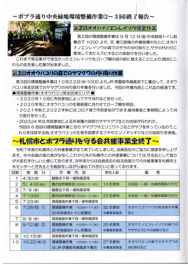 | □各種会議事業 部長会議/必要に応じて開催 専門部会議/必要に応じて開催 定期総会/R8年4月19日(日) 清明庵ホール 全体役員会/必要に応じて開催 □各種ふれあい親睦事業 親睦交流会 新年交礼会 ふれあい応援協力/介護老人ホーム「そとこと」・防災訓練・清明庵夏まつり □各種研修会参加事業 北海道町内会連合会道央ブロック大会/ 札幌市及び北区主催の各種研修会参加 屯田地区連合主催の各種研修会参加 警察署及び消防署関係の研修会参加 地域学校関係の研修会関係の参加(スクールゾーン実行委員会含む) □各種情報連絡事業 町内会広報「NORTH TONDEN」・広報「屯田」・広報「さっぽろ」全戸配布(毎月) 町内会ホームページ及びメール開設(毎月更新) 月別ごみカレンダー・各専門部のお知らせ広報全戸配布 ふれあいのまち「町内案内&防災マップ」 R8.5作成配布予定 町内会「町内ガイドブック」作成、※R8.5 配布予定 □町内会加入案内事業 新規入居者への町内会加入説明 マンション入居現状確認と町内会費説明 賛助会員への町内会加入説明(R8年度現在、13社加盟) □町内会斡旋事業 団体共同灯油購入 団体個別排雪実施 □町内会応援事業 日本アマチュア歌謡連盟札幌東支部・屯田ポプラ通りを守る会 きたとんシニアサロン・北海道絆menづくりプロジェクト 札幌屯田防犯パトロール隊「とんぼ隊」賛助会員・きたとん倶楽部 屯田太鼓・屯田音頭・介護老人ホーム「清明庵」・複合施設「ら・すれ」 □継続事業 町内会発足記念誌作成 ※10周年記念誌(平成17年7月全戸配布済) ※20周年記念誌「絆」発行(平成27年10月1日) ※30周年記念誌「継承」発行(令和7年9月1日) 記念事業/防災用品の整備(平成28年2月) □町内会備品管理保管事業 防災資機材保管庫設置(2棟)・物置(1棟)・草払機(8台)・芝刈機(2台) 交通安全旗・コピー機・一輪車(2台)・ ごみシェルター(17台) □活動収入資金事業 公園管理委託料・資源回収益金・広報さっぽろ配布手数料・住民組織助成金 集団資源回収奨励金 |
