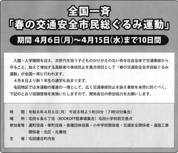 | ○町内会広報「NORTH TONDEN」全戸配布中 ○ごみ月別カレンダー全戸配布中 平成21年7月1日,ごみ有料化実施から,毎月月別カレンダー(白黒コピー)を配布継続中です。 ○防犯のぼり設置!!(とんぼ隊) 北海道で推進をしている「安全・安心・どさんこ運動」あいさつ,みまもり,たすけあいに北屯田町内会も協力をしています。 ○ふれあいのまち「町内案内&防災マップ」令和8年版 5月10日配布予定 |
