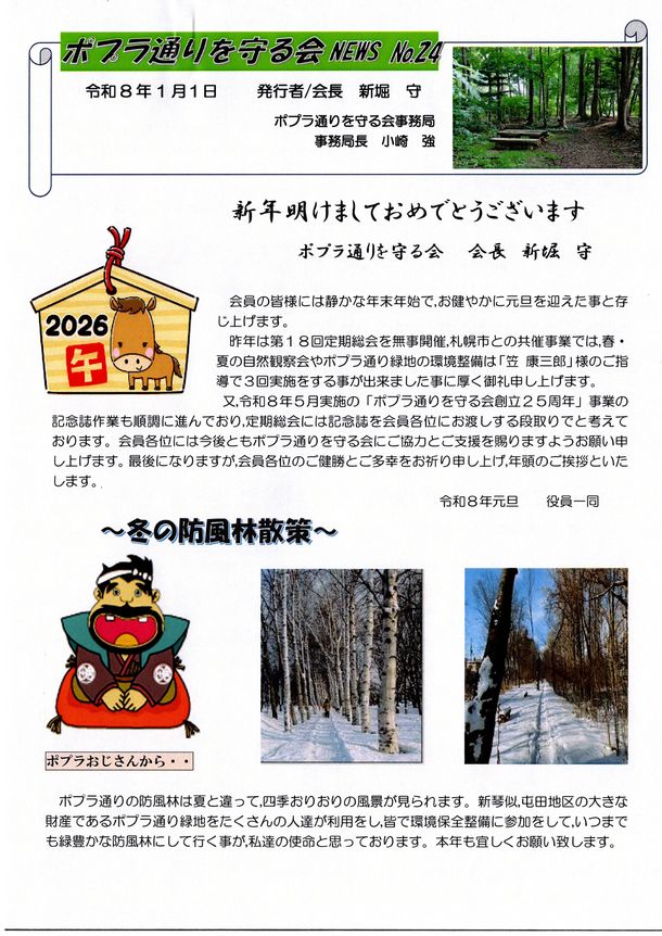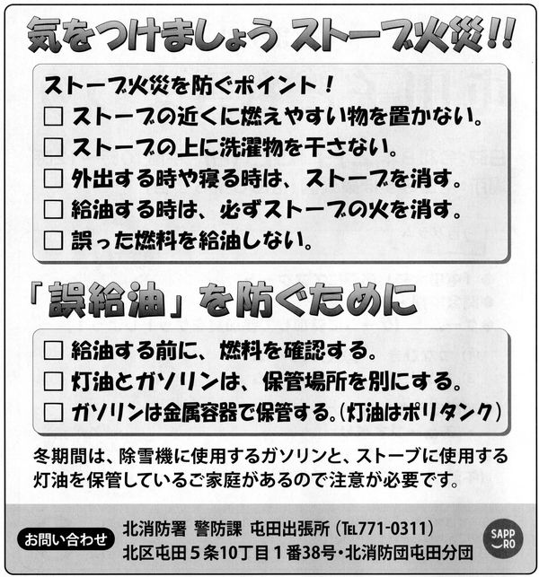 | ○町内会広報「NORTH TONDEN」全戸配布中 ○ごみ月別カレンダー全戸配布中 平成21年7月1日,ごみ有料化実施から,毎月月別カレンダー(白黒コピー)を配布継続中です。 ○防犯のぼり設置!!(とんぼ隊) 北海道で推進をしている「安全・安心・どさんこ運動」あいさつ,みまもり,たすけあいに北屯田町内会も協力をしています。 ○ふれあいのまち「町内案内&防災マップ」令和8年版 5月10日配布予定 |