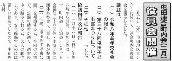 | □各種会議事業 部長会議/必要に応じて開催 専門部会議/必要に応じて開催 定期総会/R8年4月19日(日) 清明庵ホール 全体役員会/必要に応じて開催 □各種ふれあい親睦事業 親睦交流会 新年交礼会 ふれあい応援協力/介護老人ホーム「そとこと」・防災訓練・清明庵夏まつり □各種研修会参加事業 北海道町内会連合会道央ブロック大会/ 札幌市及び北区主催の各種研修会参加 屯田地区連合主催の各種研修会参加 警察署及び消防署関係の研修会参加 地域学校関係の研修会関係の参加(スクールゾーン実行委員会含む) □各種情報連絡事業 町内会広報「NORTH TONDEN」・広報「屯田」・広報「さっぽろ」全戸配布(毎月) 町内会ホームページ及びメール開設(毎月更新) 月別ごみカレンダー・各専門部のお知らせ広報全戸配布 ふれあいのまち「町内案内&防災マップ」 R8.5作成配布予定 町内会「町内ガイドブック」作成、※R8.5 配布予定 □町内会加入案内事業 新規入居者への町内会加入説明 マンション入居現状確認と町内会費説明 賛助会員への町内会加入説明(R8年度現在、13社加盟) □町内会斡旋事業 団体共同灯油購入 団体個別排雪実施 □町内会応援事業 日本アマチュア歌謡連盟札幌東支部・屯田ポプラ通りを守る会 きたとんシニアサロン・北海道絆menづくりプロジェクト 札幌屯田防犯パトロール隊「とんぼ隊」賛助会員・きたとん倶楽部 屯田太鼓・屯田音頭・介護老人ホーム「清明庵」・複合施設「ら・すれ」 □継続事業 町内会発足記念誌作成 ※10周年記念誌(平成17年7月全戸配布済) ※20周年記念誌「絆」発行(平成27年10月1日) ※30周年記念誌「継承」発行(令和7年9月1日) 記念事業/防災用品の整備(平成28年2月) □町内会備品管理保管事業 防災資機材保管庫設置(2棟)・物置(1棟)・草払機(8台)・芝刈機(2台) 交通安全旗・コピー機・一輪車(2台)・ ごみシェルター(17台) □活動収入資金事業 公園管理委託料・資源回収益金・広報さっぽろ配布手数料・住民組織助成金 集団資源回収奨励金 |